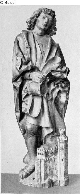 Standing on a pedestal with a turreted castle. In her right hand she holds a wooden tub, her head is slightly tilted to one side, and she wears a wrinkled cloak. Carved wood, flattened back, old gold and colour finish. Illustration in auction catalogue, plate 34.