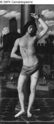Panel painting: Depiction: St. Sebastian tied to a tree or post, being pierced by arrows & city view; landscape with man-made structures & castle, palace; tie; tree; post; arrow & city; landscape & castle; palace; Signature: On the plinth: MARCVS BASAITI . P; Dimensions: 217 x 102 cm