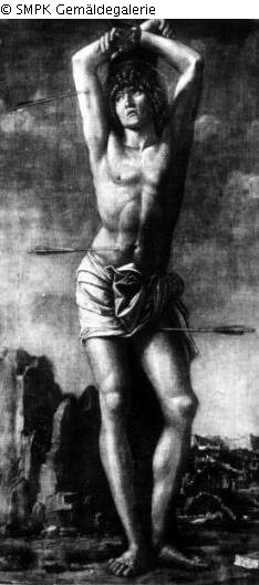 Panel painting: Depiction: St. Sebastian tied to a tree or post, pierced by arrows & prospect of a city, city panorama, silhouette of a city; tie; tree; post; arrow & panorama; silhouette; Inscription lower right on a painted slip: Zoane Batista de Antonjo Banbasato a fato fare 1485; Signature: see 'Description'; Measures: 152 x 73 cm