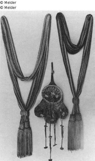 The long, narrow sash has red (eleven) and white vertical stripes. A tassel with long red and white cords is attached to each end. The weave of the bulging ring holding the field bandage together and the tassels' frets form a vertical red and white prong pattern. The sash is partially worn.