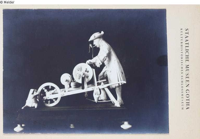 Scissors grinder with barrow and dog, on a black wooden pedestal with ivory feet; the grinder smokes a pipe, the lid of which dangles on a delicate chain made by the master turner Jusatz from Gotha; signed on the pedestal as "CALük".