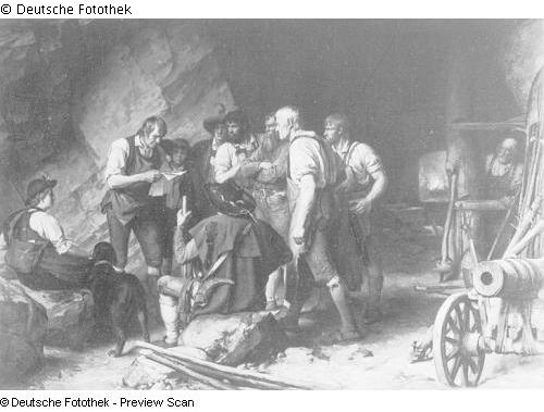 Search Request | Object report The Scythe Forge before the Tyrolean Revolt in 1809 Lost Art-ID126930 Previous Next Artist / Creator Defregger, Franz von Birth 1835.04.30, Stronach (Tirol) Death 1921.01.02, München Place of activityInnsbruck; München TitleThe Scythe Forge before the Tyrolean Revolt in 1809 Dating1883Object typePaintingGroup of reported objectsPaintingMaterial / TechniqueCanvas / painted Height 158.00 cm Width 225.00 cm Inventory number2388Provenance 1883 from the International Art Exhibition in Munich. Read more Read less Published since2001 Contact Staatliche Kunstsammlungen Dresden Galerie Neue Meister Tzschirnerplatz 2 01067 Dresden Germany Phone(0351) 4914 9730E-Mailgnm@skd.museumHomepagehttp://www.skd.museum Contact DirektionPhone(0351) 4914 9730E-Mailgnm@skd.museum