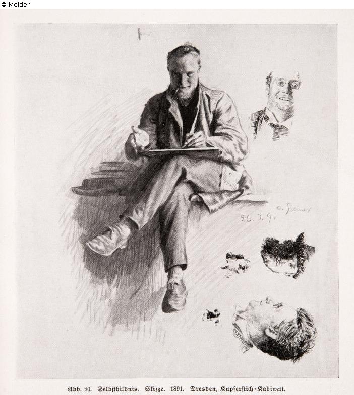 The draughtsman is depicted from the front, seated and with the drawing pad on his knees. On the right, two portrait studies of the Kammersänger Gerhäuser/Meyer and one of the artist. Signature: On the right: Otto Greiner 26.3.91.