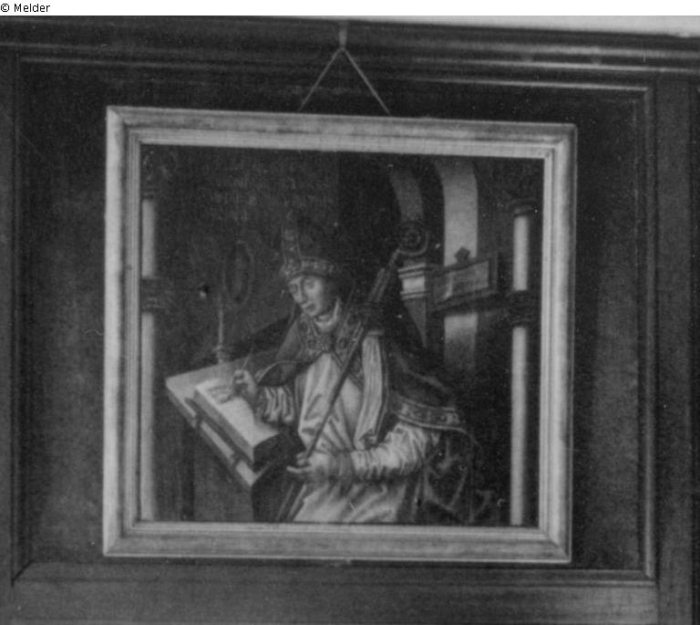 Panel painting of St. Hilary in bishop's vestment writing in a book.