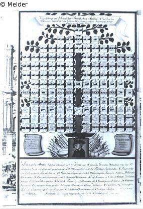 Aquarell in Goldrahmen unter Glas. Im oberen Teil des Bildes ist auf einem rosa Band: "Verzeichnis der Königlichen Preussischen Armee ... Berlin, den 21. Oktober 1784" zu lesen. Am Beginn des Stammbaumes befindet sich ein Bildnis Friedrich des Großen umgeben von Fahnentrophäen. Den Abschluss bildet eine Übersicht zum Gesamtbestand der Armee.