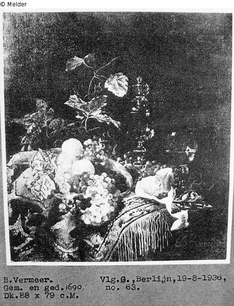 Auf persischer Tischdecke ein Korb mit Weintrauben und Pfirsichen, rechts ein halb gefülltes Weinglas, eine geschälte Zitrone und ein Granatapfel. Im Hintergrund ein Glaspokal. Signiert und Datiert B. Vermeer 1690