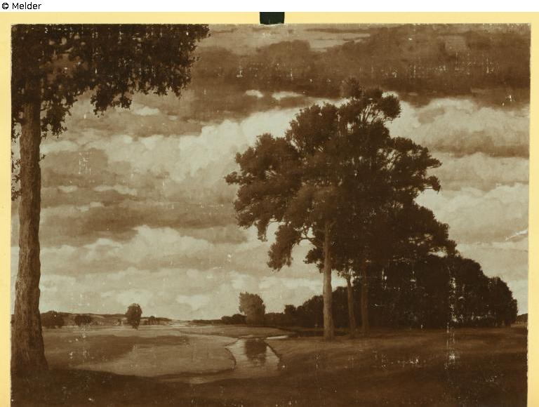 Panel painting: Image: summer landscape; landscape denoting summer (in the division of the year into four seasons) & evening landscape (sometimes named as: vespers) & stream & groups of trees & meadow, pastureland