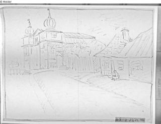 folio or loose-leaf book-like collection of drawings/paintings of synagogues; the folio contains individual paintings that were made in a combination of drawing, and painting with watercolors, gouache and perhaps pastel(s); at first glance, the folio seems to be a book; however, inside one finds the individual, loose, unbound drawings/paintings