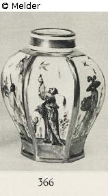 Six-sided, bulged, the ribs are gold plated. Painted with large-scale Höroldtszenen. Man with feather hat and a man luring a bird. Gold number: 20, 40