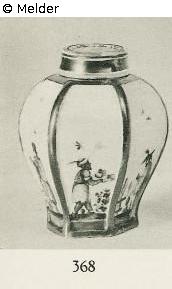 Six-sided, bulged, ribs are gilded. Painted with Höroldtszenen. In each field is a figure, a Chinese, a Mohr, who serves fruits. Gold number: 25 and R. The cover is slightly damaged.