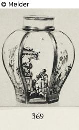 Six-sided, bulged, ribs are gilded. In the fields are Höroldtmalerei. Colorful Chinese figures, including a porcelain painter. Without brand.