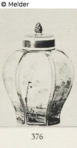 Six-sided, bulged. Lid knob. All-round view with sailboats and figures on the shore. Without brand. In gold: 84 (rubbed gold ribs).