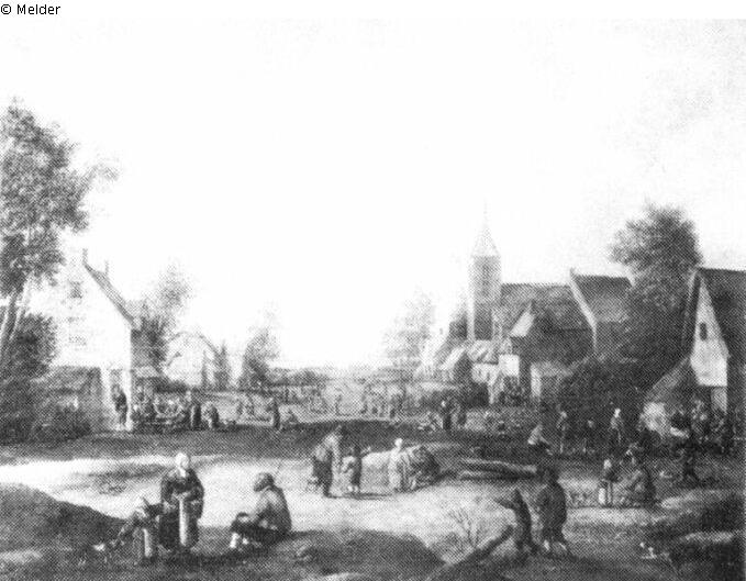 A wide crowded street with buildings on both its side. To the right is a church with a four-cornered bell-tower, to the left is a tavern. Outside the tavern is a company of players at a table.