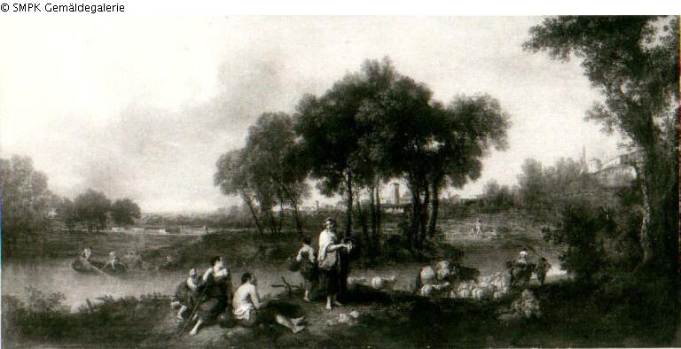 Wooded river landscape with shepherds