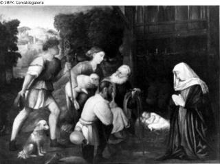 Tafelmalerei: Bild: die Anbetung des Christuskindes durch die Hirten (im Beisein Marias und Josephs); Hirte
