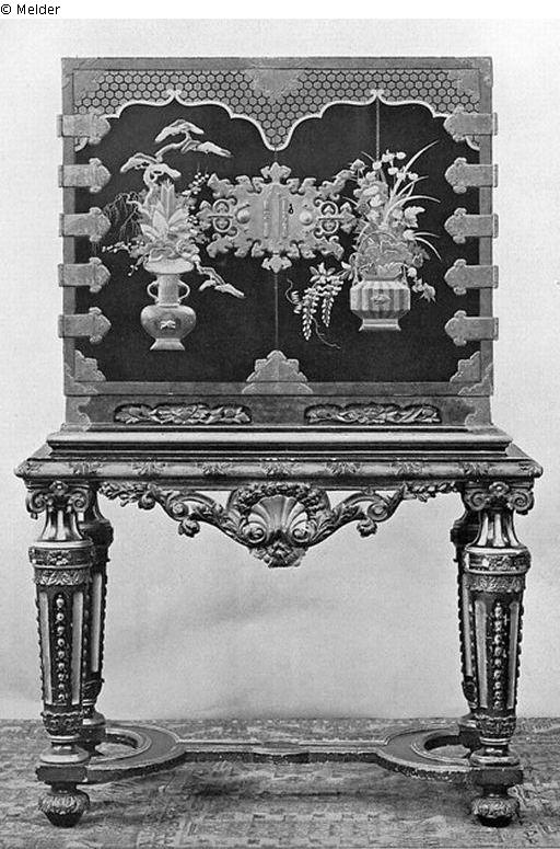 lacquered cupboard of rare beauty. The upperside has two black laquered doors and a relief of a vase and basket woth flowers in bronze, and a relief flowers in red, brown and golden lacquer. The richly cut underpiece is black laquered, painted in many colors and gilded and is carried by four grooved legs with a cross connection.The doors are decorated with a richly decorated bronze lock, hinges and edgedecorations. Inside ten blach laquered drawers with landscapes in golden laque, with copper handle