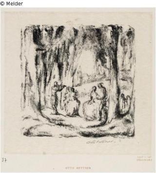 Found-Object Report Dancing couples with violinist under trees Artist / Creator Hettner, Otto Object type Print Material / TechniquePaper / printed (lithography)Lost Art-ID429477
