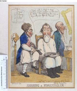 Found-Object Report Shaving a Forestaller Artist / Creator Rowlandson, Thomas (published by Rudolph Ackermann) Artist / Creator Woodward, George Moutard (after) Object type Print Material / TechniquePaper / printed (etching) colouredLost Art-ID622890