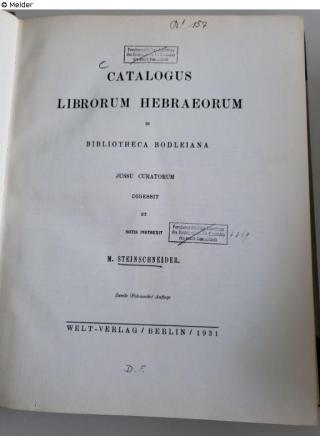 Found-Object Report Catalogus Librorum Hebraeorum in Bibliotheca Bodleiana 1: Anonyma Author Steinschneider, M. Publisher Welt-Verlag Object type Book Lost Art-ID634261
