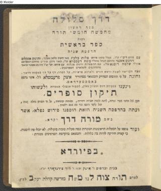 Found-Object Report Dereḵ Selûlā: hû' Ḥamiššā ḥumšê tôrā 'im pē Rašī we-targûm Onkelos we-targûm aškenazī / [1]: Be-rêšît Hadpāsā 2. Publisher Zürndorfer Object type Book Lost Art-ID612442