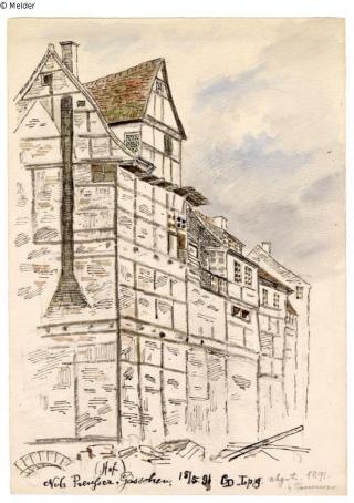 Found-Object Report Der Hof von Preußergässchen 6 (abgebrochen im Sommer 1891) | The courtyard of Preußergässchen 6 (demolished in summer 1891) Artist / Creator Drescher, Heinrich Georg Object type Drawing Material / TechniquePaperLost Art-ID612390