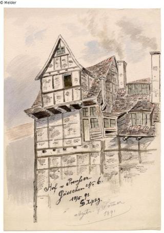 Found-Object Report Der Hof von Preußergässchen 6 (abgebrochen im Sommer 1891) / The courtyard of Preußergässchen 6 (demolished in summer 1891) Artist / Creator Drescher, Heinrich Georg Object type Watercolour Material / TechniqueWatercolour ; Paper / watercolouredLost Art-ID612389